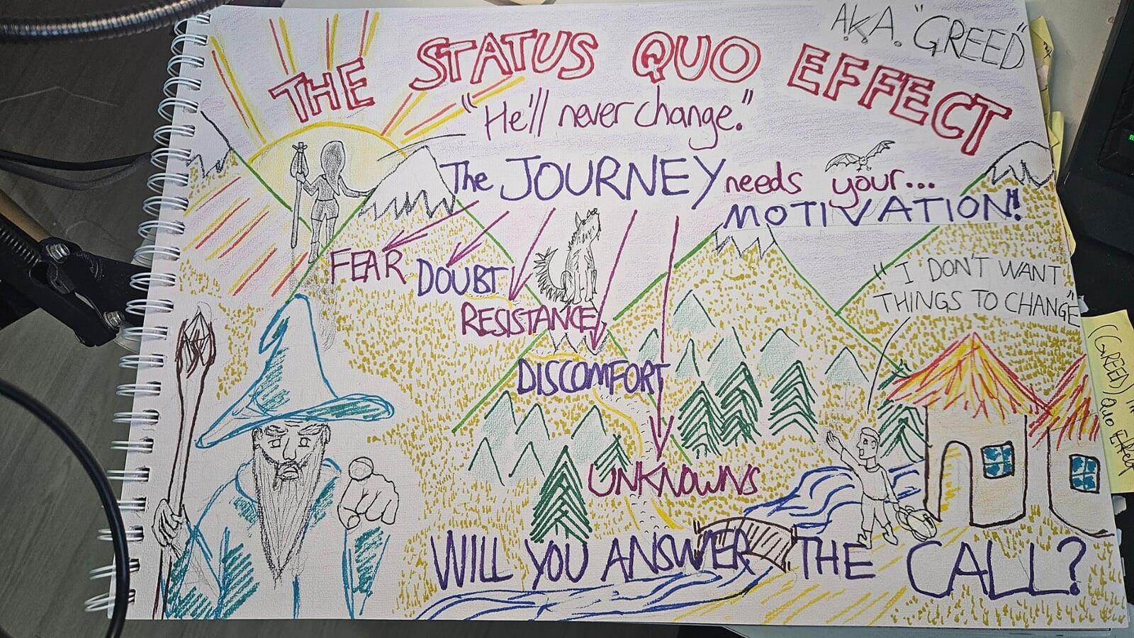 I go over it in the video (below), but here's a rough visual to show how the Status Quo Effect stops us, and how accepting your Journey helps change her mind: